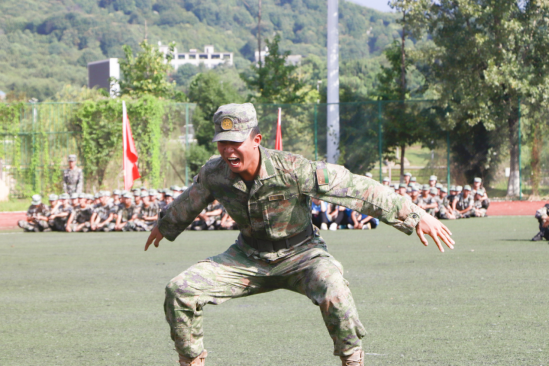 在欢呼、红旗、迷彩、彩烟的围绕下,2023级新生踏着矫健的步伐,排列着整齐的方阵,开始军训汇报展示。分列式的展示显现了新生们的团结一心,勇于拼搏的精神。军体拳的展示,新生们如蛟龙出海,腾挪躲闪,体现新生全面的身体素质。刺杀操展示,双方对垒,硬马硬桥,一招一式全是硬功夫。战术演练展示,模拟烟雾弹让现场扑朔迷离,对阵双方全副伪装迷彩武装,精神抖擞从浓雾中杀出,视觉恍如战争大片,他们帅气的形象引起现场热烈掌声。