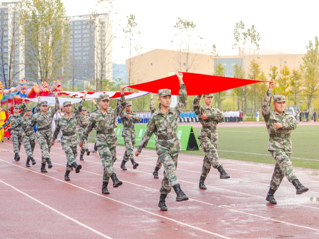 开幕式上由校教官队组成的护旗方队英姿飒爽,他们伴随着慷慨激昂的《运动员进行曲》,迈着矫健的步伐,引导全体运动员穿过主席台接受学校领导的检阅。待全体运动员列队整齐,现场举行了国旗升旗仪式,随着《义勇军进行曲》响起,全场师生共唱国歌,向伟大的祖国母亲致敬。