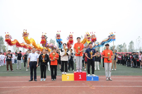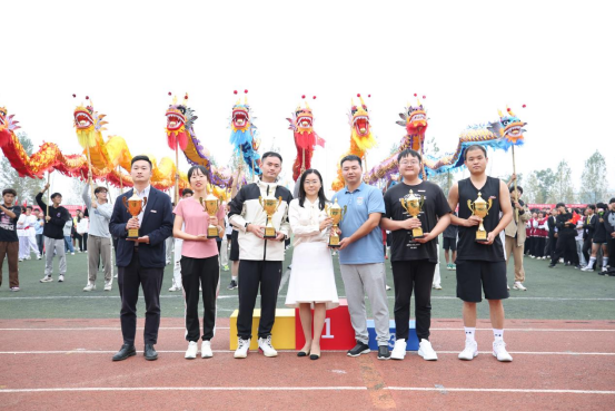 运动会总裁判长李梁华宣读了本届运动会比赛成绩及获奖单位。江作军为优秀组织奖获得单位颁奖;干甜为“精神文明奖”获得单位颁奖;江星为教工组团体总分前六名获得单位颁奖;房小珍为学生甲组团体总分前六名获得单位颁奖;张敏为学生乙组团体总分前六名获得单位颁奖;谢远健为广播体操比赛获奖单位颁奖。
