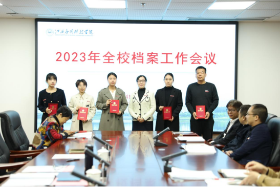 会上表彰了董事会办公室、校长办公室、光华宝石与艺术设计学院、体育学院、音乐学院5个2022年度档案工作先进集体,骆晓玉、钟勇、李诗婷等15位先进个人。