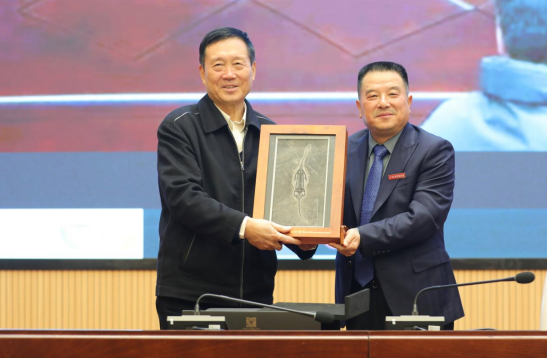 黄玉林董事长赠予张德江教授宝石博物馆化石标本,以此感谢张德江教授长期以来对学校发展的关心指导。