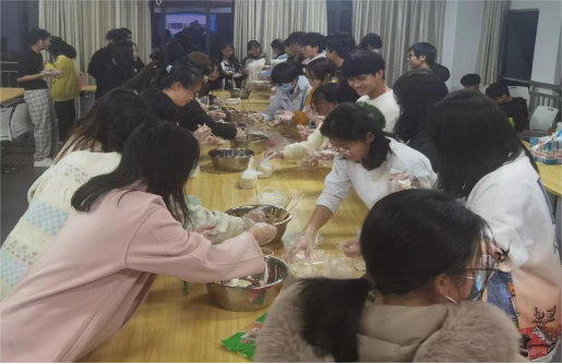 12月14日晚,现代管理学院组织在校班级学生开展包饺子劳动教育。学院预先准备好了饺子皮和饺子馅,同学们在各班级负责人的协调下,迫不及待地尝试起来。部分校领导、学院领导、辅导员也来到现场进行技术指导,使参加劳动的学生更加熟练地掌握了包饺子的技能。有的同学是第一次包饺子,在老师的指导下包得有模有样;有的同学操作娴熟,包出来的饺子敦实精巧;有的同学创意十足,包出了“玫瑰花”“小笼包”“四喜”“小鱼”等花式饺子……一两个小时的时间,几百个形态各异的饺子跃然于眼前。