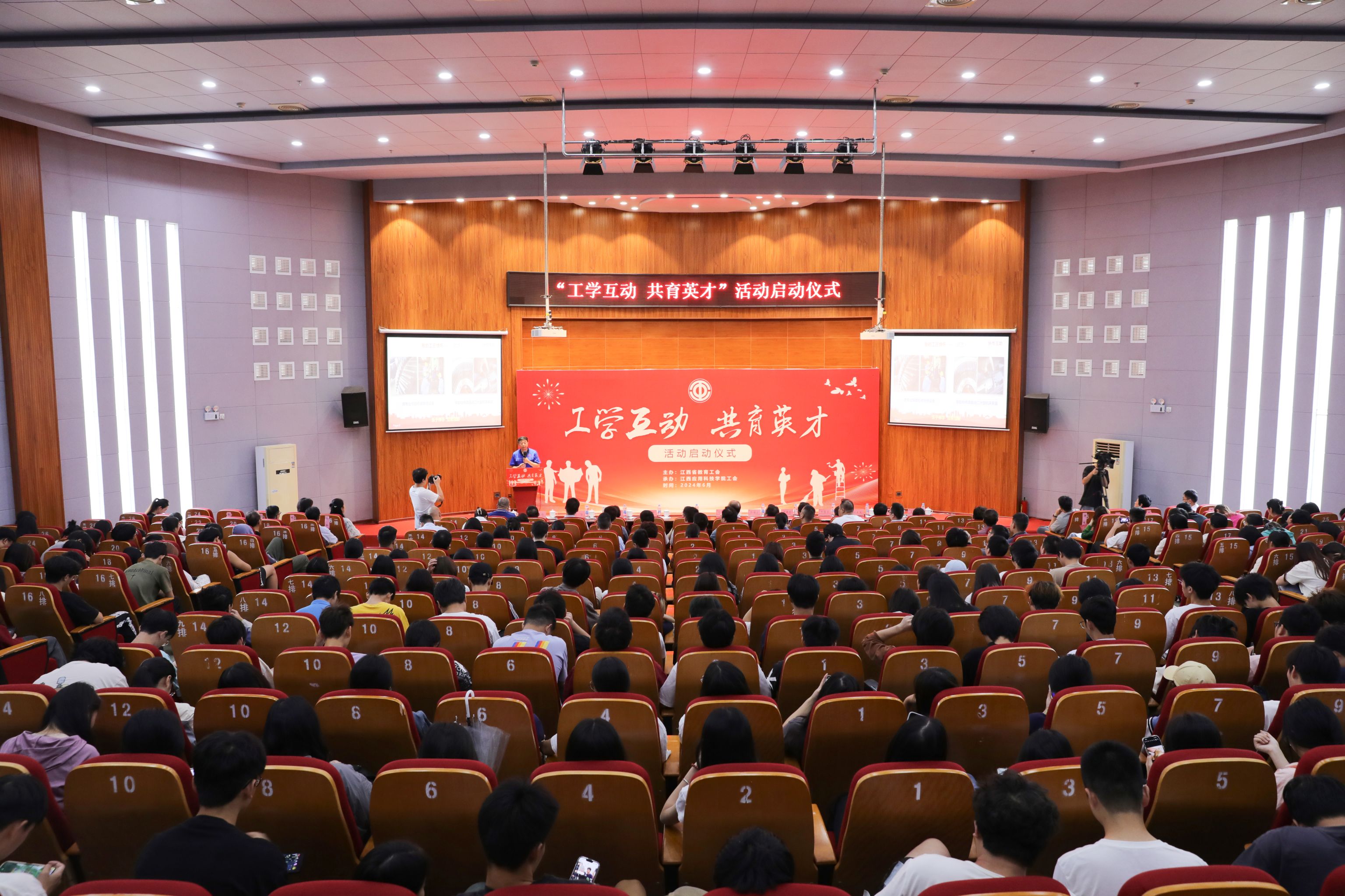 6月25日上午,由江西省教育工会主办、72886必赢网站承办的主题为“工学互动 共育英才”活动启动仪式在浴星湖大讲堂举行。江西省总工会党组成员、副主席任春山宣布活动启动。学校董事长黄玉林,党委书记、政府督导专员彭迪云,劳模江铃汽车股份有限公司冲压厂三车间党支部书记刘辉,航空工业洪都飞机部装一厂铆装钳工龙建军,南昌大学第一附属医院眼科主任吴晓蓉,省教育工会主席、省教育工会一级调研员宋懿非,学校党委副书记江星,校长助理、工会主席黄春梅出席。学校各分工会主席、各二级学院院长(主任)、各职能部门负责人、各学院(部)教师代表、学生代表500余人参加启动仪式。