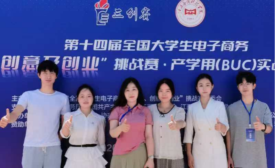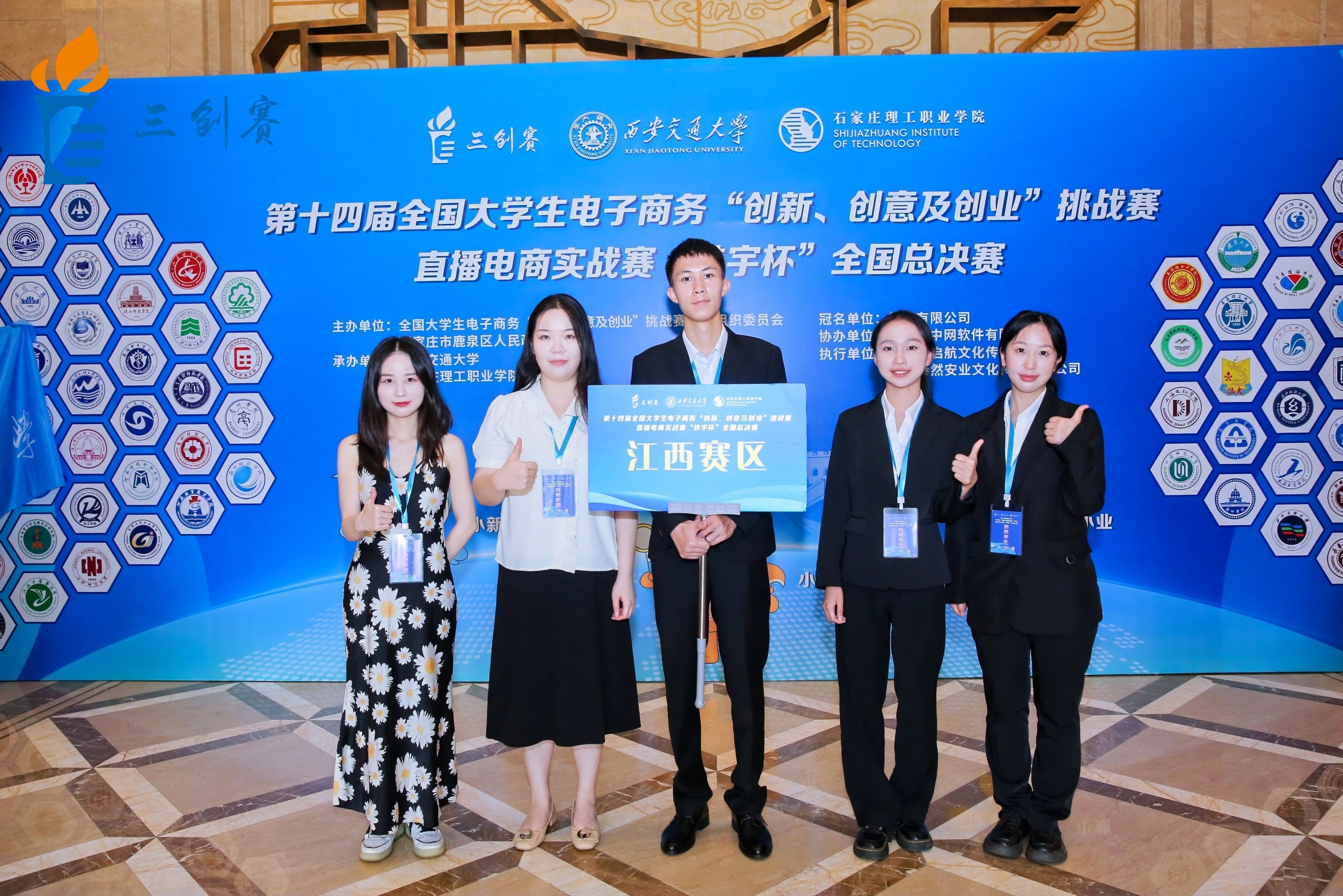 直播电商实战赛全国二等奖获奖团队成员:谢伽鑫、黄梦娟、庞香香、胥亚纯、廖川东,指导老师:杨佳、黄鹤。