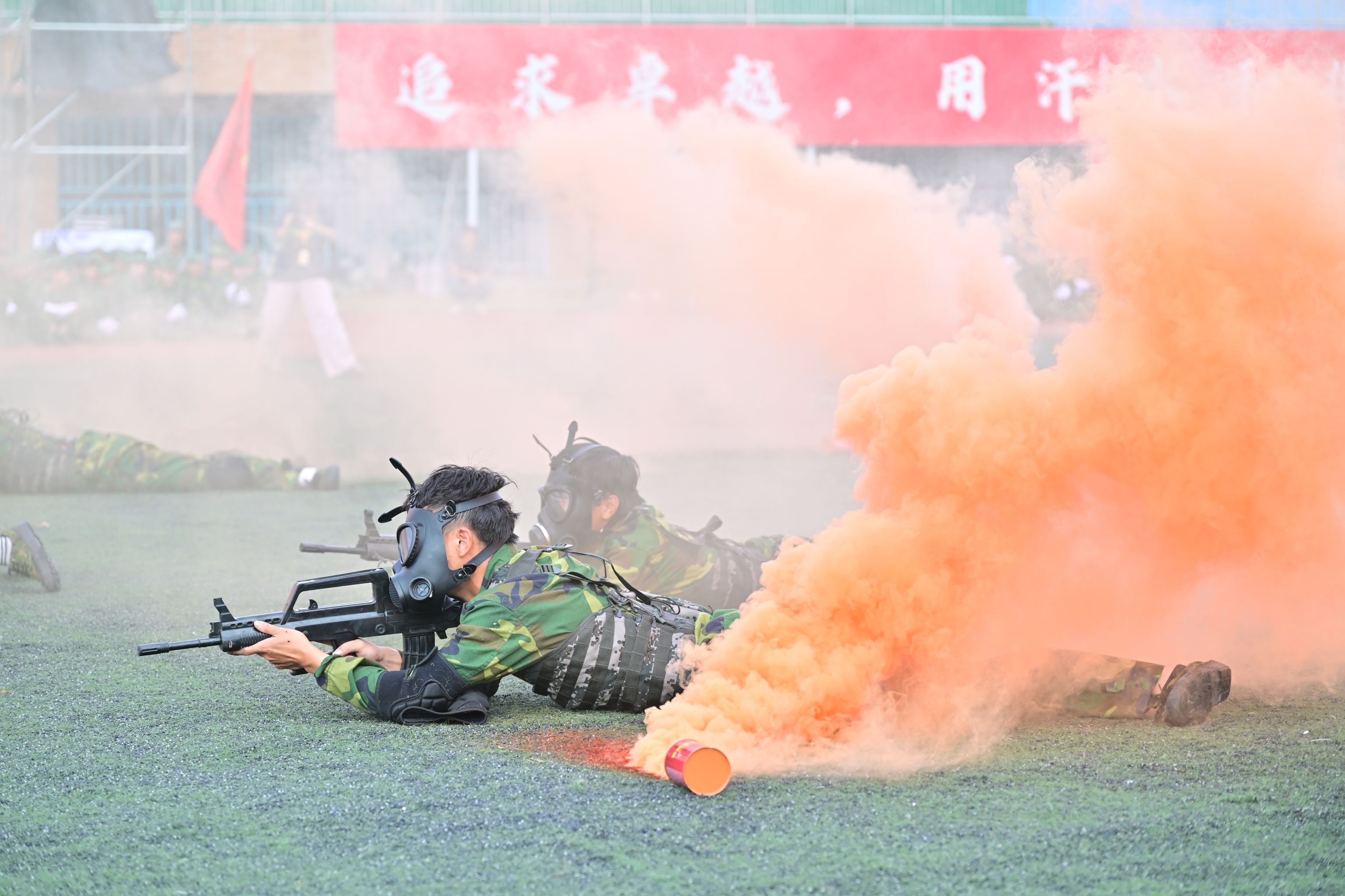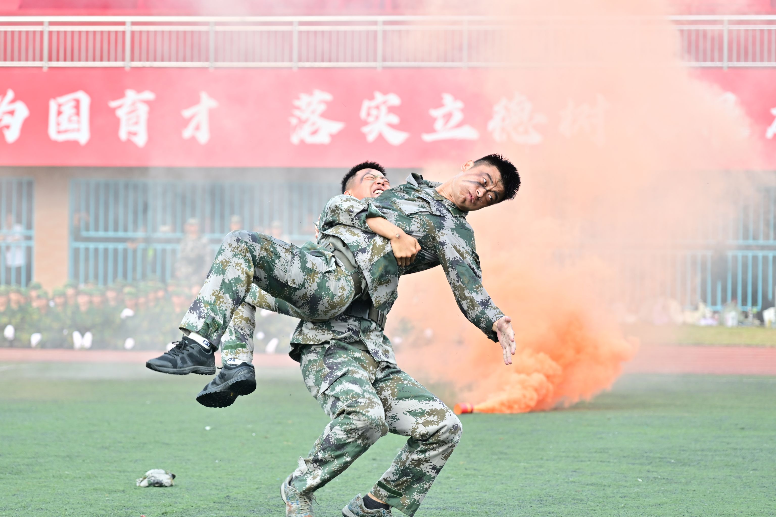 庄严的国歌声响起,同学们昂首挺胸,齐唱国歌,嘹亮的歌声在运动场回荡。在气势磅礴的方阵汇报表演结束后,班队列阵依次进行了分列式、军体拳表演、刺杀操表演、匕首操、战术演练、枪械分解与组装、模拟射击等科目展示,动作干净利落、整齐划一。