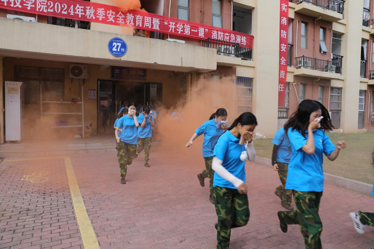 宋晓卫宣布演练开始,一场模拟火灾迅速在学生宿舍27栋“爆发”。烟雾弥漫,紧急疏散警报响起,楼栋管理员迅速反应,上报火情并启动疏散程序。学生们在楼层长的引导下,遵循“不恋物、捂口鼻、低身姿、顺内墙”的原则,有序撤离至安全地带,整个疏散过程迅速而有序。