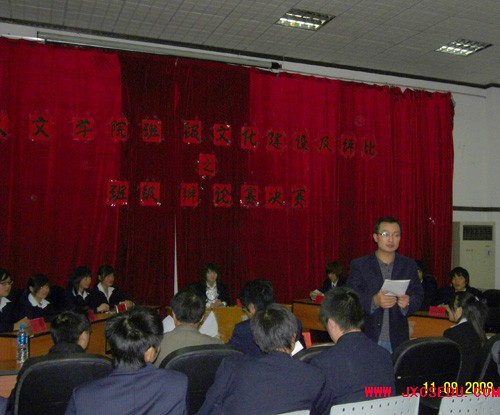 本次辩论赛共有四支队伍,分别是08新闻班、08法律班、08广告设计与制作、08旅游管理班。四支队伍有着不俗的实力,在预赛中过五关、斩六将进入决赛。现场人潮涌动,座无虚席。本次比赛分二小组先后进行。先由新闻08班辩法律08班,辩题为“电脑是否将取代书本”;08广告设计辩08旅游管理,辩题为“个人利益与群体利益是否可以两全”。双方在精彩的陈词中拉开序幕,对方辩手就事论事,阐明观点,立场明确;在第二攻辩环节中,双方引经据点,唇齿清楚,激烈的争辩博得了场下观众的阵阵掌声;在第三节的自由辩论中,正方双方互问互答。畅古论今,见缝插针,双方水平发挥超常,你来我往,将本次辩论推向高潮;在第四节总结陈词时,双方再次阐明观点,证明立场。最终,新闻08班荣获第一名,法律08班获得第二名;最佳辩手是魏明成、申薇莫。