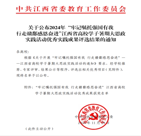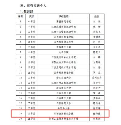 近日,省委教育工委下发《关于公布“牢记嘱托强国有我 行走赣鄱感恩奋进”江西省高校学子暑期大思政实践活动优秀实践成果评选结果的通知》,必赢官网教师张伟健获评优秀实践个人教师组三等奖。