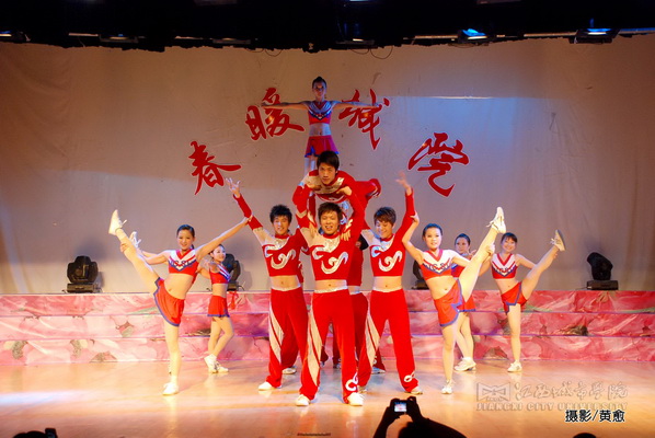 啦啦操《星城之鹰》动感、欢快的节奏,展现出了城院雄鹰搏击长空的决心,高难度的表演赢得在场观众的阵阵掌声,并将整场晚会推向高潮。清华大学心理学系主任彭凯平教授兴奋地跃上舞台,代表此次全国认知科学学术研讨会主办方向城院表示衷心的感谢。他说:“从今天开始,江西城市学院有可能成为认知科学的发源地。”清华大学心理学系教授蔡曙山及两位专家的即兴表演,让整台晚会掀起了一浪又一浪热潮。