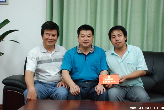 今年考取中国音乐学院合唱指挥专业全国唯一统招录取的音乐硕士研究生李新荣(右)与学校董事长黄玉林(中)、音乐学院副院长赖良淦(左)留影