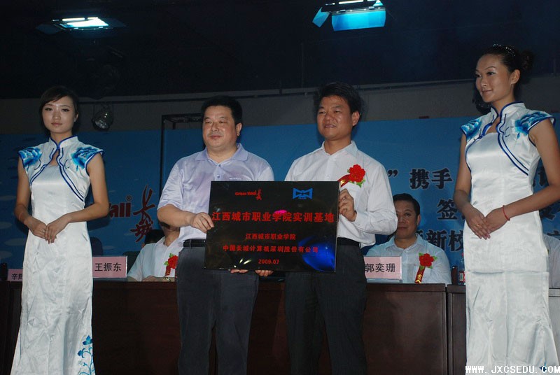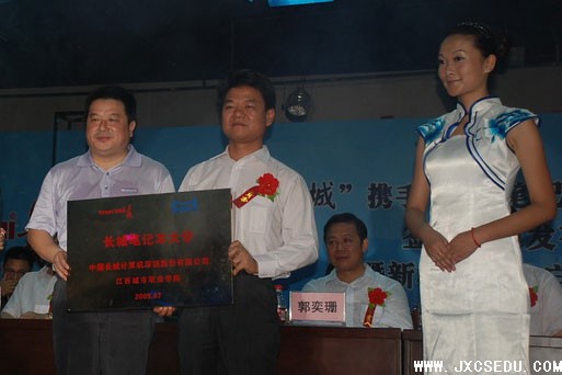 7月23日下午4时,江西城市学院与中国长城计算机(深圳)股份有限公司在江西城市学院星城校区隆重举行 “城城携手,打造笔记本大学,实现校园信息化”大型签约仪式,宣告“城(江西城院)城(长城电脑)”携手,共同打造国内第一所真正意义的“笔记本大学” 正式启动。省政协副主席陈安众,省教育厅副厅长郭奕珊,中国长城计算机(深圳)股份有限公司总裁周庚申,省人大科教文卫主任委员严平、王振东,省人民政府办公厅副主任叶磊,省信息产业厅副厅长李江河,江西师范大学党委书记傅修延,南昌移动公司副总经理柳建义,江西城市学院董事长黄玉林,中共湾里区委书记戴晓明,中共新建县委书记胡敏等出席了签约仪式并在主席台前排就坐,城市学院师生五百余人参加了签约仪式。
