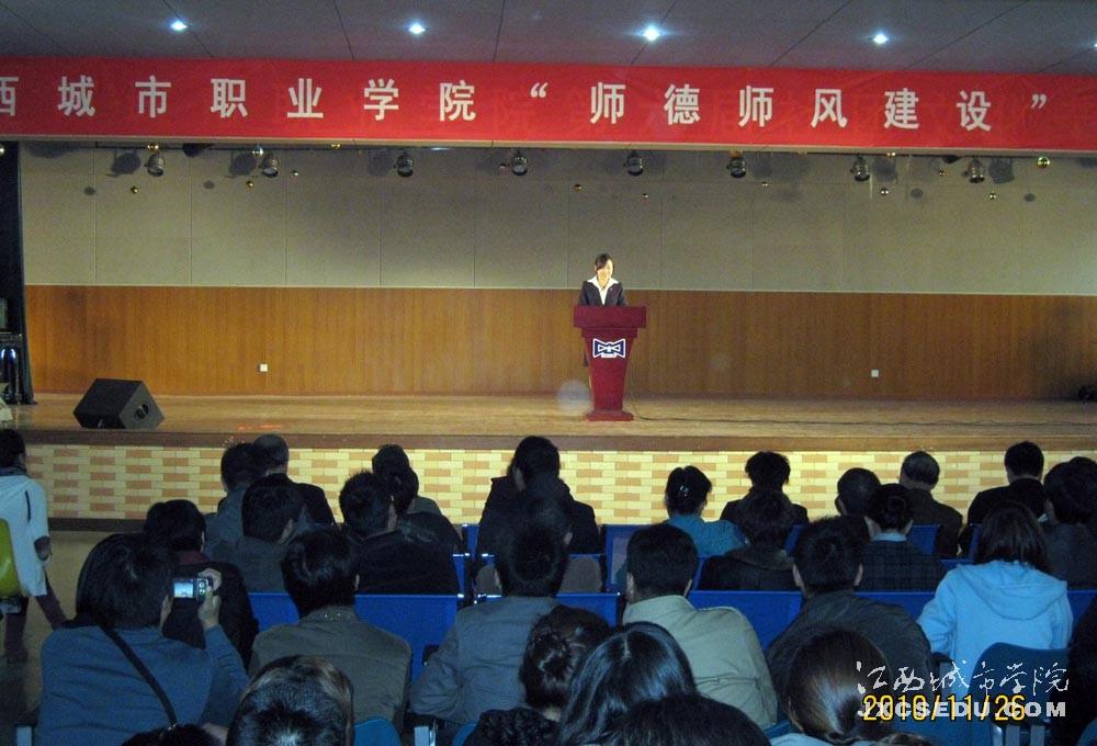 2010年11月26日下午江西城市职业学院“师德师风建设”演讲比赛总决赛在活动中心演播大厅举行,全场座无虚席,现场气氛异常热烈。出席总决赛的评委有副校长黄珍珍;教务处处长郑淑媛、督导室主任,学工处、思政部,实训中心、基础部负责人以及各学院院长。