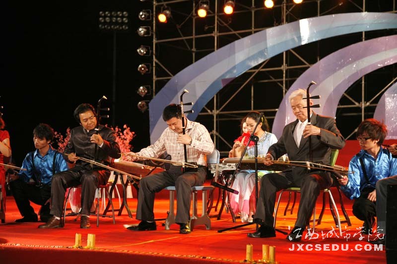 黄玉林董事长与江西著名二胡表演家郭明河、著名作曲家田颂刚等同台献艺(摄影/黄愈)