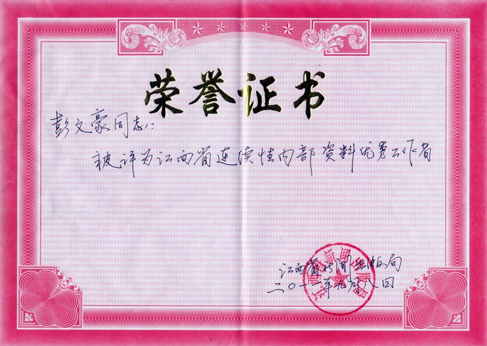 必赢官网彭文豪同志荣获江西省连续性内部资料优秀工作者