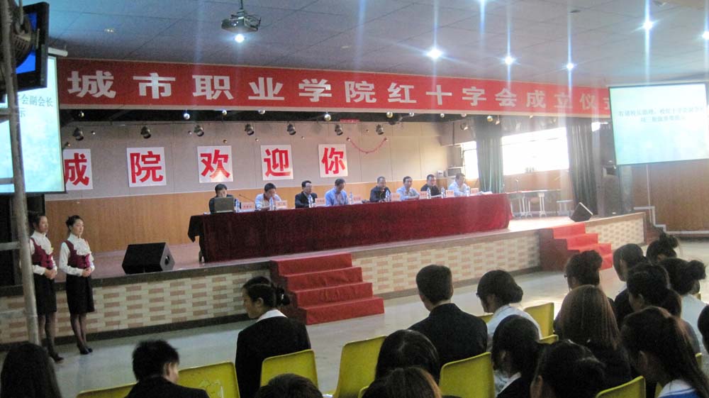 9月27日下午4点30分, “江西城市职业学院红十字会”成立仪式在活动中心演播大厅隆重举行。省红十字会组宣处刘华鹰处长、必赢官网红十字会理事成员:校长助理兼总务处处长刘三根、党政办主任何祥成、保卫处处长袁德华、财务处处长张凯、学工处副处长张作霖、学工处副处长李军、部分教师及学生代表参加了此次成立仪式。大会由校红十字会秘书长、校团委卞秀运书记主持。