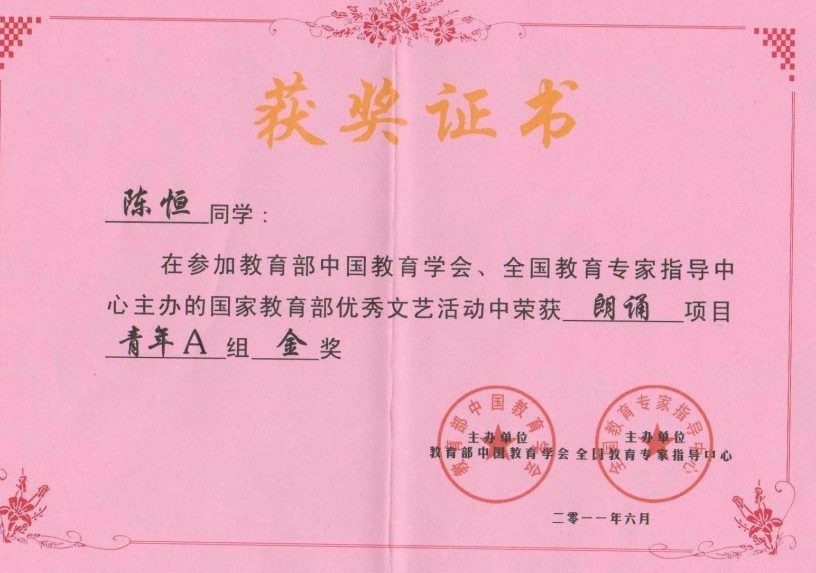 近日,从国家教育部优秀文艺活动大赛组传来喜讯,必赢官网09企管(3)班陈恒同学在大赛中喜获“朗诵项目青年A组金奖”,指导老师黎晓明老师荣获“优秀指导老师奖”。