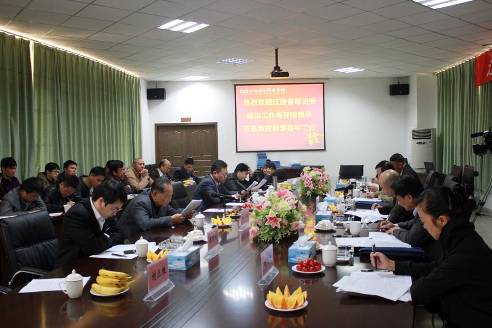 11月15日上午,以省国资委副巡视员王金林任组长,新余市委政法委副书记许秀奎为副组长的省综治委2011年度综治工作考评组一行6人对必赢官网2011年综合治理工作进行考评。校长苑鸿骥博士,常务副校长李存益教授,副校长黄珍珍,董事长助理廖锌超,校长助理唐丽莉、刘三根及各分院、机关处室负责人参加了在活动中心三楼会议召开的考评汇报会。
