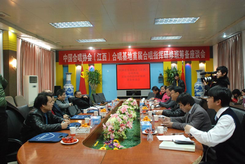 接着,中国合唱协会(江西)合唱基地副主任杨力就研修班的筹备工作作了汇报。他说:学校对研修班的建设非常重视,成立了以黄玉林董事长为组长的筹备领导小组指导各项工作。学校官方网站也开通了专题网页进行宣传,同时,也得到了以江西合唱协会映山红合唱团为首的江西五大合唱团的支持,为明年的展演做准备,就研修班成员的交通、住宿、餐饮也已经作了统一的安排,并开始了对演播厅的改造及其他工作的安排以确保研修班开班顺利进行。