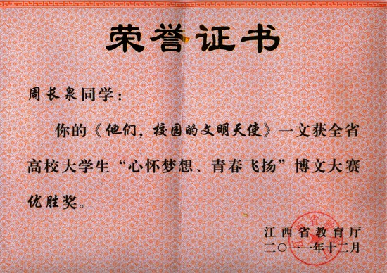 《他们,校园的文明天使》(作者 周长泉)在“心怀梦想、青春飞扬”博文大赛中获优胜奖