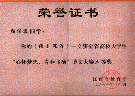 《谁主沉浮》(作者 张佳蕊)在“心怀梦想、青春飞扬”博文大赛中获三等奖