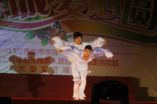 晚会上,艺术团残疾演员们表演了舞蹈、器乐、声乐、书画等节目。其中,聋人演员表演的《年年有余》、《黄土黄》等舞蹈表达了残疾人对美的追求和对爱的渴望;双人舞《鹰之翼》以及肢残演员演唱的《我相信》、《寻梦》等展示了残疾人抗拒命运的勇气和蓬勃向上的生活热情;舞蹈《千手观音》给予了观众精神上、视觉上巨大的震撼。同学们被这种顽强的意志和奋发向上的生活态度所感染,台下不时响起一阵阵热烈的掌声。