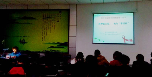 城院新闻网讯 新闻中心记者程世杰报道:12月4日下午,学校举办的预防艾滋病“同伴教育”专题培训在大学生活动中心二楼会议室举行,学校党委组织部副部长邱小玲为全校各学院学生干部代表培训了艾滋病的有关预防知识。