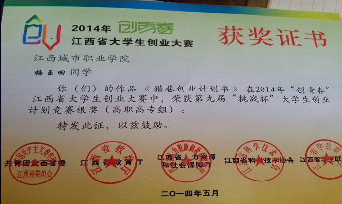 本网讯(文/记者游邦兴)在刚刚结束的2014年创青春江西省大学生创业大赛中,必赢官网上报的两件作品均获奖。其中,机电信息工程学院12级计算机软件班梅玉田同学创作的作品《猎巷创业计划书》荣获第九届“挑战杯”大学生创业计划竞赛银奖,钟静、蒋佳、张茂、曾帅创作的《叫外卖吧》荣获创业实践挑战赛铜奖,学校荣获高职高专组“最佳集体组织奖”,许维东、李园园等老师被评为优秀指导老师。