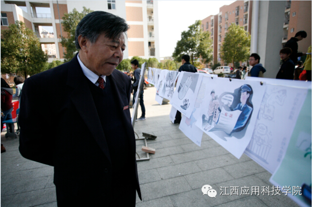 (图为校长胡振鹏教授仔细观看普法漫画展)
