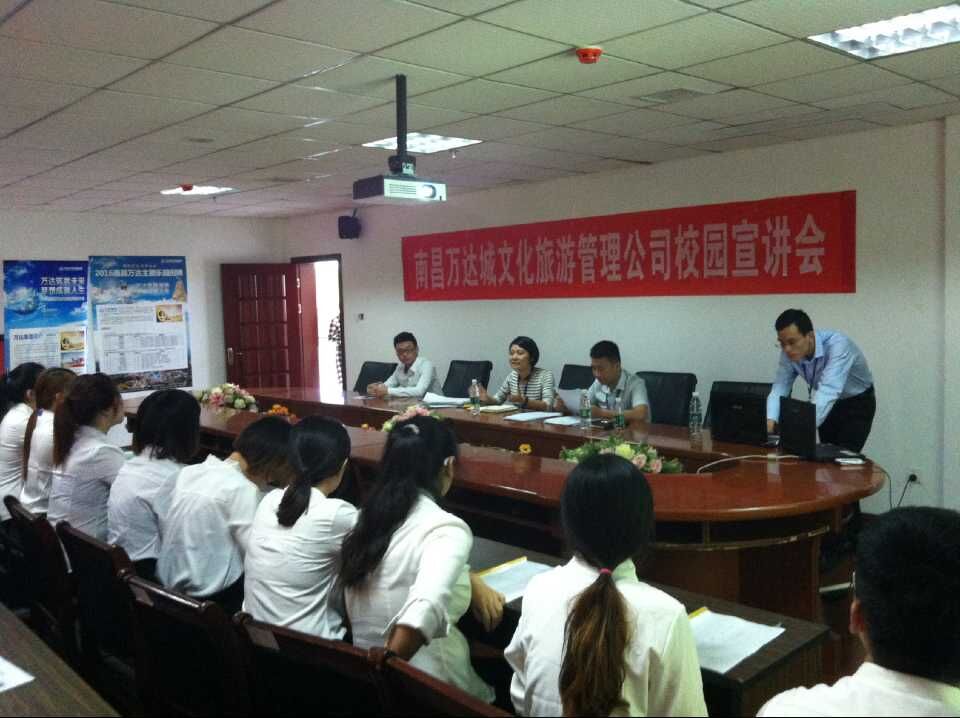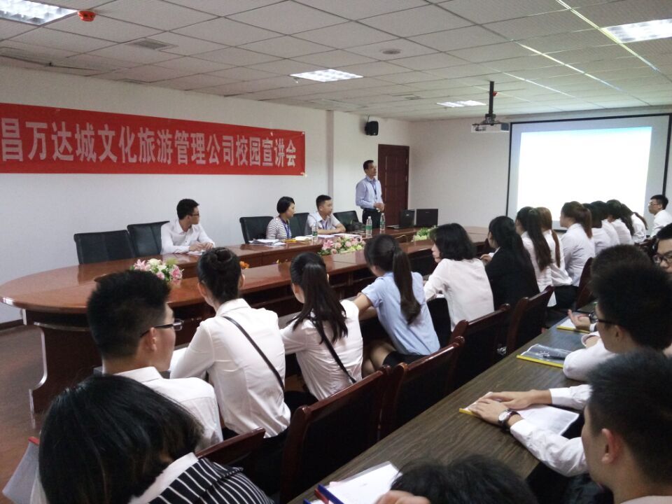面试之前,万达城文化旅游管理公司人事部的工作人员首先介绍了企业的文化、战略目标以及荣誉等方面。面试过程中,同学们也都非常珍惜这次工作的机会,准备的非常充足,统一着装,简历完善,通过自我介绍等环节充分展示了自己的才华。