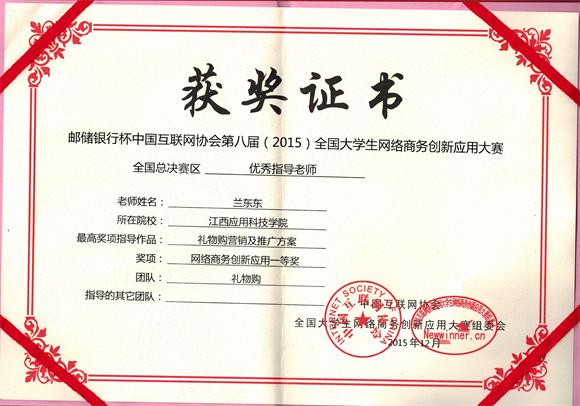 与此同时,必赢官网经济管理学院13级市场营销2班张伟健同学作为大赛组委会特邀志愿者全程参与了本次大赛全国总决赛现场的志愿者活动,由于工作认真仔细、表现优秀,张伟健同学被评为第八届全国大学生网络商务创新应用大赛优秀志愿者,由大赛组委会为其颁发获奖证书与奖牌。