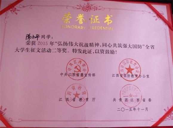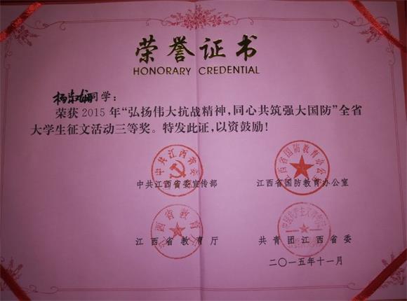 本网讯(记者团记者 刘金)近日,记者从全省青少年学生国防教育主题活动颁奖大会上获悉,经过两个月的筹备和评选,2015年江西省青少年国防教育主题活动圆满落幕。至此,全省大学生征文获奖名单随之出炉。