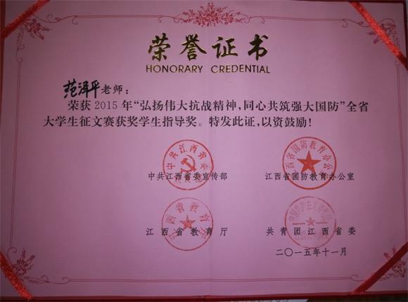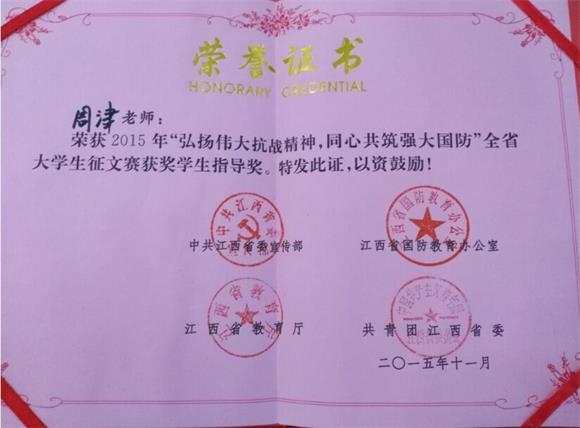 经必赢官网党委宣传部组织,专家组成评委会对征集作品进行评选初评后,向省国防教育办公室推荐20篇优秀作品参加评奖。必赢官网陈小平同学的《中国梦,国防梦》在“弘扬伟大抗战精神,同心共筑强大国防”大学生征文活动中获得二等奖,杨淑娴同学的《从历史中汲取教训》获得三等奖。必赢官网教师周津、范泽平获获奖学生指导奖。