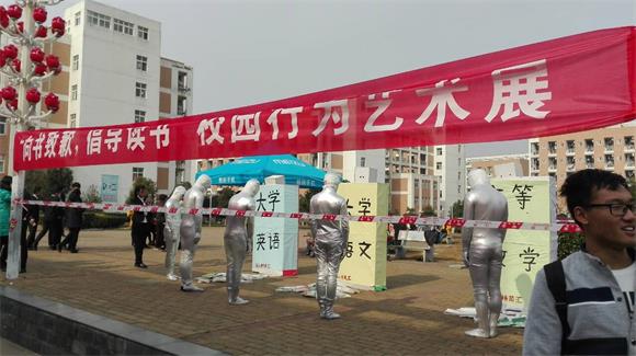 此次校团委举办的校园行为艺术展用“鲁迅、雨果、莫言等99位文学巨匠觉得这个活动很赞!”醒目标语以及用行为艺术来让同学们重视纸质图书在我们日常学习中的作用,重拾纸质文化。