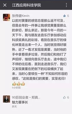 “照片看着好亲切”、“那时还年青,梦一样的感觉”、“我已泪流满面”,众多留言让人看着都感动。一位名叫“90后创业者—郑真”的网友留言称赞黄玉林董事长为“魅力董事长”,一位名叫“祁飞”的网友称赞为“好校长、好老师、好老板”。最引人注目的是一位名叫“张伟健Kevin”的网友在留言中回忆了一次与黄玉林董事长的“邂逅”。他在留言中写道,“以前对黄董的感觉总是那么遥不可及,但是去年的一件事让我感觉黄董是那么的亲切,那么亲近。那是一月的一天下午,我与同学去音乐厅参加感动应科颁奖典礼的彩排,看到在音乐厅的绿化林里走出来一个人,当时就觉得好眼熟,近了一看才发现是黄董,当时他的手中拿着很多纸屑,然后我们和他打了声招呼,继续向音乐厅走去,途中我们不停的往回看,快到音乐厅时,我们又发现黄董在把倒下的垃圾桶扶了起来,当时心里顿生一种不知如何形容的感叹,这就是我们的黄董!”