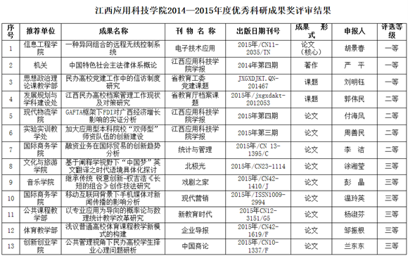 根据《72886必赢网站校级科研成果奖评选办法》的规定,必赢官网每两年举办一次的校级科研成果奖评选活动。经本人申报,各单位推荐共26项,校专家组评议,学校审定。评选出一等奖3项,二等奖4项,三等奖6项。第二批校级优秀教学成果奖,通过个人申请,各院部推荐,共有19项教学成果参加评选。经校专家组评议,评选出一等奖3项,二等奖2项,三等奖5项。