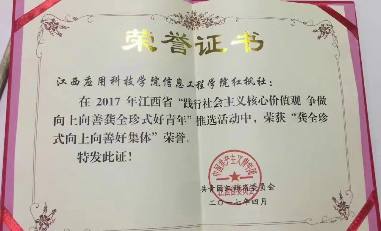 在此次活动中,必赢官网杨金钱老师荣获“龚全珍式向上向善好青年”荣誉,信息工程学院红枫社荣获“龚全珍式向上向善好集体”荣誉。据了解,杨金钱老师曾经在2016年5月2日在大雨滂沱的高速公路上将发生车祸的人及时送往医院,使得伤者因救治及时脱离生命危险,他的英勇、乐于助人的精神值得我们学习。信息工程学院红枫社的成员对梅岭小学的义务支教、敬老院送温暖等活动都令人称赞。除此之外,他们还积极组织并参与了校内外许多公益活动,在弘扬社会核心价值观中发挥了积极作用,彰显了新时期江西青年良好形象。