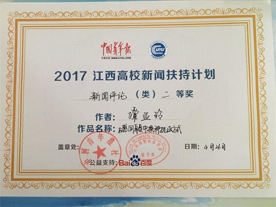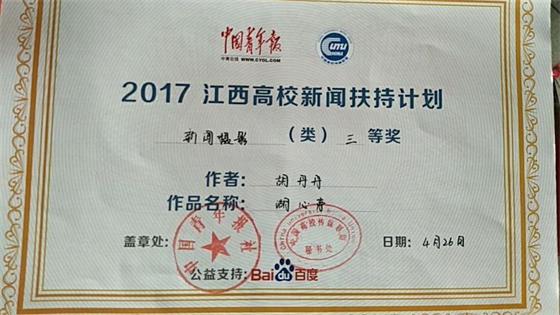 本网讯(记者团记者/王梦芳)4月26日,从中国(江西)高校传媒联盟获悉,在中国(江西)高校传媒联盟主办的2017江西高校新闻扶持计划中必赢官网党委宣传部记者团三名成员喜获佳绩,其中2015级新闻采编与制作1班谭亚玲作品《在感同身受中换种执法方式》获新闻评论类二等奖;2015级国际商务2班王小妹作品《时光》获新闻摄影类二等奖;2016级视觉传达2班胡丹丹作品《湖心亭》获新闻摄影类三等奖。