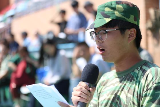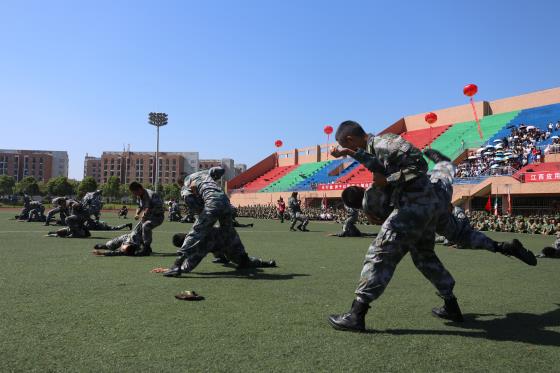 伴随着嘹亮的歌声,学校董事长黄玉林在军训团团长罗安的陪同下步入阅兵场,依次检阅新生军训方队。检阅结束后,新生军训方队踏着《中国人民解放军进行曲》的激昂旋律依次走过主席台,进行分列式汇报表演。同学们稚气的脸上透着坚毅,是新生,更像老兵,他们军容严整、号音嘹亮、英姿飒爽、脚步铿锵,半个月的艰苦训练在他们脸上留下了成长的印记。
