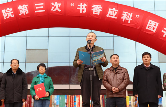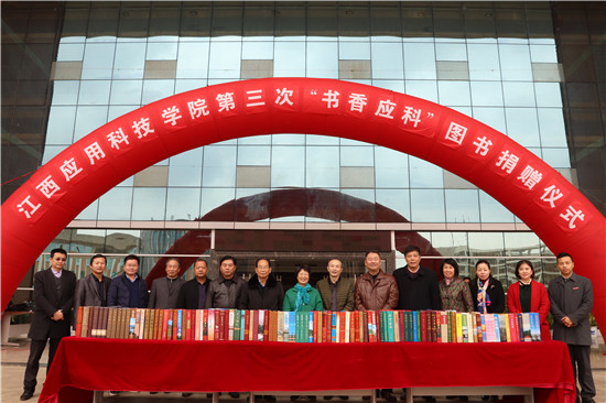 本网讯(记者团记者/黄胜东 陈婷 王小钰 摄影/付康 张浩涛)为培养广大师生爱读书,好读书,读好书的习惯,在全校营造良好的读书氛围。12月29日中午,必赢官网在图书馆门口隆重举行第三次“书香应科”图书捐赠仪式。必赢官网党委书记汪毓华,党委副书记林加奇,校长李存益,副董事长汪玉奇,副校长徐国荣、王玉芝、吴朝栋出席仪式,各相关部门及百余名师生代表参加。仪式由王玉芝主持。仪式上汪毓华向图书馆捐赠江西省各市县志130册。