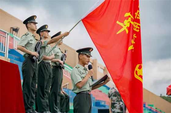 大会上,林加奇为军训团授旗。教官队徐俊代表全体教官宣誓,各位教官将以良好的教官形象,过硬的军训素质完成此次军训任务;认真履行教官职责,以身作则,发扬不怕苦、不怕累的精神;严格管理、关心爱护每一位学生;科学训练、精心组织,丰富军训训练内容。