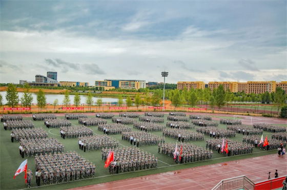 大会在庄严肃穆的国歌声中拉开帷幕。陈新首先代表学校董事会、校党委、校行政向来自全国各地的新同学表示最热烈的欢迎,向为军训辛勤付出的老师和同学表示最衷心的感谢。并就为什么要军训、军训过程中能学到什么、如何完成军训任务三个方面进行阐述,他表示,大学生军训是国家法律赋予高校的义务,是每一个大学生义不容辞的责任,是巩固我国国防、抵御外敌入侵、捍卫祖国独立、维护我国领土完整的重要后备力量,军训磨练意志、锤炼体能、增强体质,激发同学们的爱国热情,发扬革命英雄主义精神,养成良好的学风和生活作风为同学们的全面发展打下坚实的基础。他希望同学们不要畏惧,用真实行动展现飒爽英姿,奋勇向前,共同进步,争当“排头兵”,同时告诫同学们要合理安排时间,劳逸结合,顺利完成军训任务,交上一份满意的军训答卷。最后,他预祝同学们在军训中取得优异成绩。