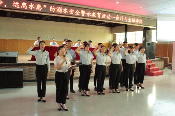 会上,会计与金融学院学生刘玲宣读倡议书,关于提高自身防范意识提出五点倡议。学生代表肖婉萱带领全体学生起立并握拳宣誓,自愿成为防溺水安全警示教育的志愿者。