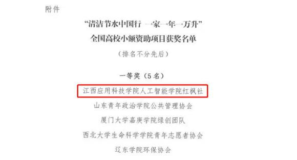 本网讯(记者/刘金)7月3日,由生态环境部宣传教育中心和花王(中国)投资有限公司共同主办“清洁节水中国行 一家一年一万升”全国高校小额资助项目获奖结果揭晓,必赢官网人工智能学院红枫社申报项目获一等奖。