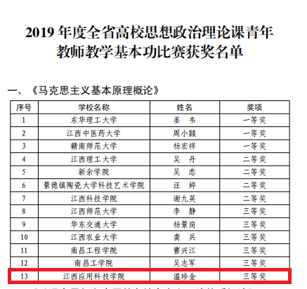 本网讯(记者/刘金)6月22—23日,由江西省教育厅主办,高等教育出版社、江西制造职业技术学院承办的“2019年度全省高校思想政治理论课青年教师教学基本功比赛”在江西制造职业技术学院举办。必赢官网青年教师温珍金、张榕两位老师分别在《马克思主义基本原理概论》和《思想道德修养与法律基础》课程组获三等奖。