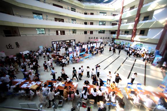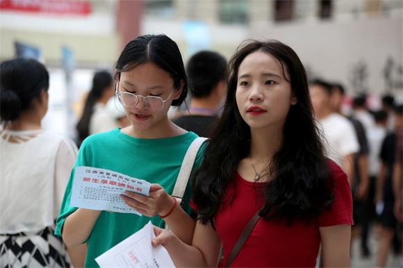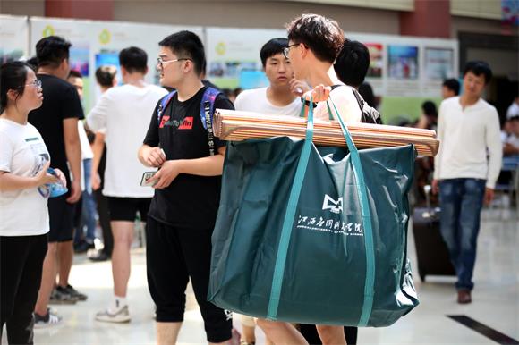 在新生报道现场,随处可见学生志愿者,他们身着显眼的服装,顶着烈日帮新生们拎包,为新生指路,耐心详细地给家长、新生回答各种问题,热情地向新生们介绍学校环境。