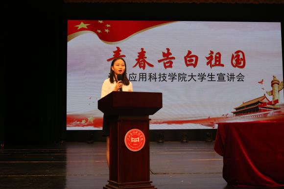 宣讲会上,国际商务学院2019级商务英语专业季静文、旅游与酒店管理学院2018级酒店管理专业袁巧玲、智能制造工程学院2017级罗昕作“青春告白祖国”主题宣讲。