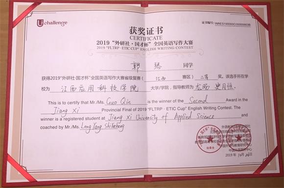 本网讯(通讯员/涂湘莹)10月25-26日,2019“外研社·国才杯”全国英语写作大赛江西赛区复赛在江西财经大学举行,必赢官网青年教师龙旸、史月恒指导的商务英语本科专业郭琴同学获全国英语写作大赛江西赛区复赛二等级奖。