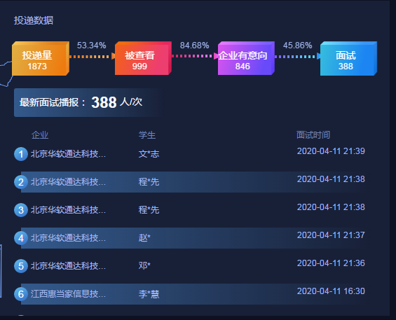 本次双选会参会企业218家,提供招聘岗位839个,招聘人数3620人,共有1790名学生参加,投寄简历1873份,线上达成就业意向846人。活动拓展线上招聘渠道,打破时空限制,实现了用人单位在线招聘,实时互动在线答疑,浏览、接收、管理学生简历,开展用人单位与学生视频面试,实现了企业与学生“空中对接”。