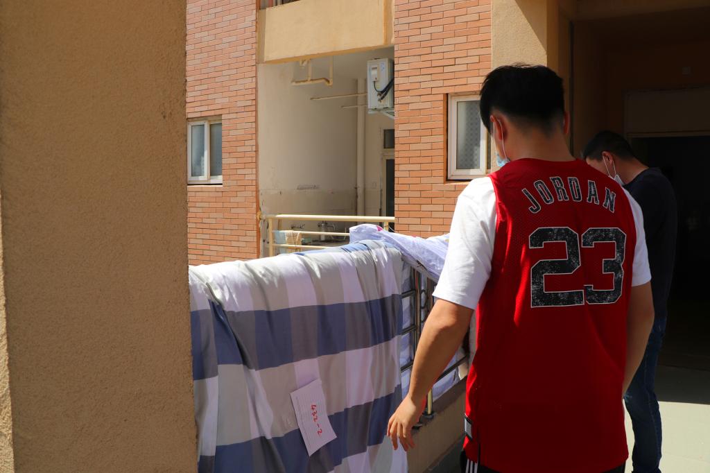 学生即将错峰返校,72886必赢网站各学院辅导员,在班级群征求班级学生同意的情况下,打开寝室门通风,为班级同学晒被子,从一楼到六楼,来来回回无数趟。为便于区分,辅导员们提前一天写好标签,详细到宿舍和床铺,晾晒被子的同时还喷洒消毒液为学生的被子消毒。