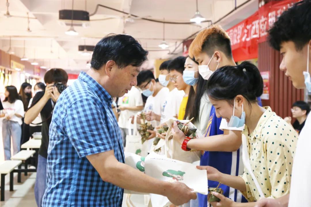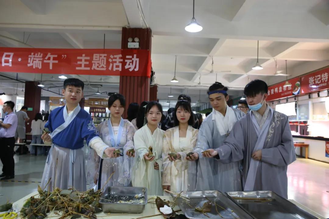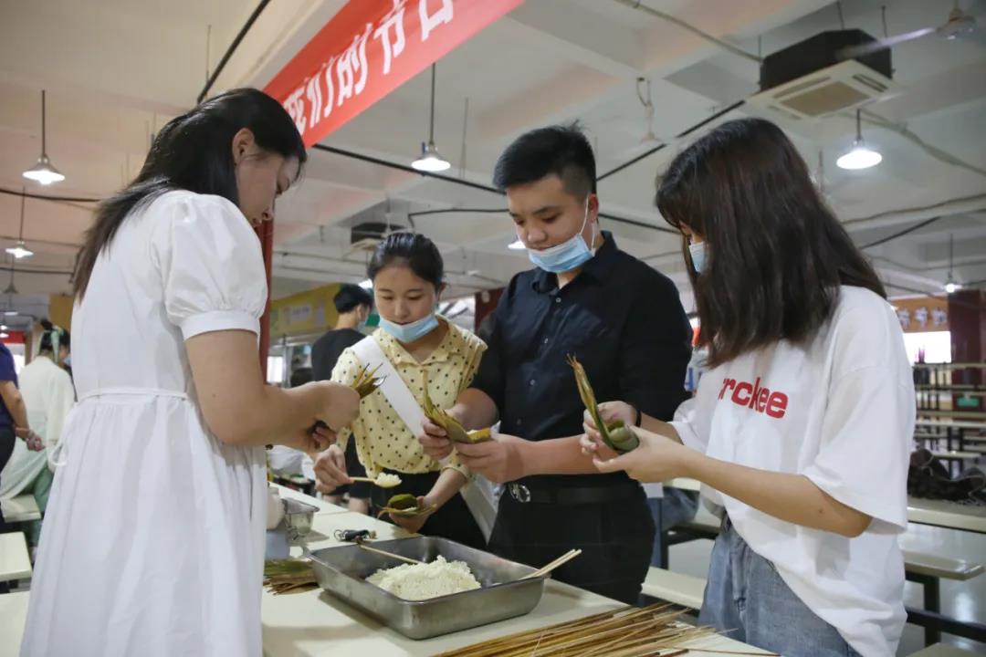 一场充满浓浓糯香的包粽子比赛在学校食堂举行,大家自觉有序地保持着科学安全距离,根据分工,大家进行淘米、洗粽叶,学校后勤部门为此次活动提供了丰富的原料,辅导员、食堂阿姨也热心上阵进行现场教学,看着食堂阿姨手指翻飞,不一会一只漂亮诱人的粽子出现,大家纷纷撸起袖子开始尝试,现场气氛欢乐又火热。热腾腾的粽子出锅后,大家吃着自己包的粽子,讨论着端午节的习俗和文化知识,场面温馨而融洽。与此同时,学校外环路上,整齐有序地排列着风格各异的摊位,摆放着各式各样的小商品,同学们精心布置,吸引着来往同学驻足选购。